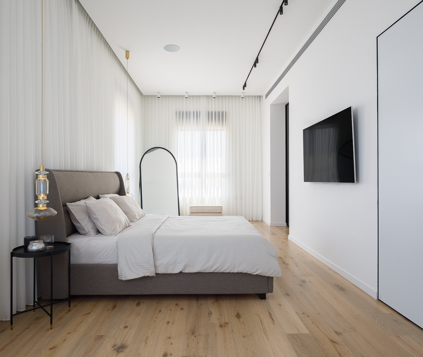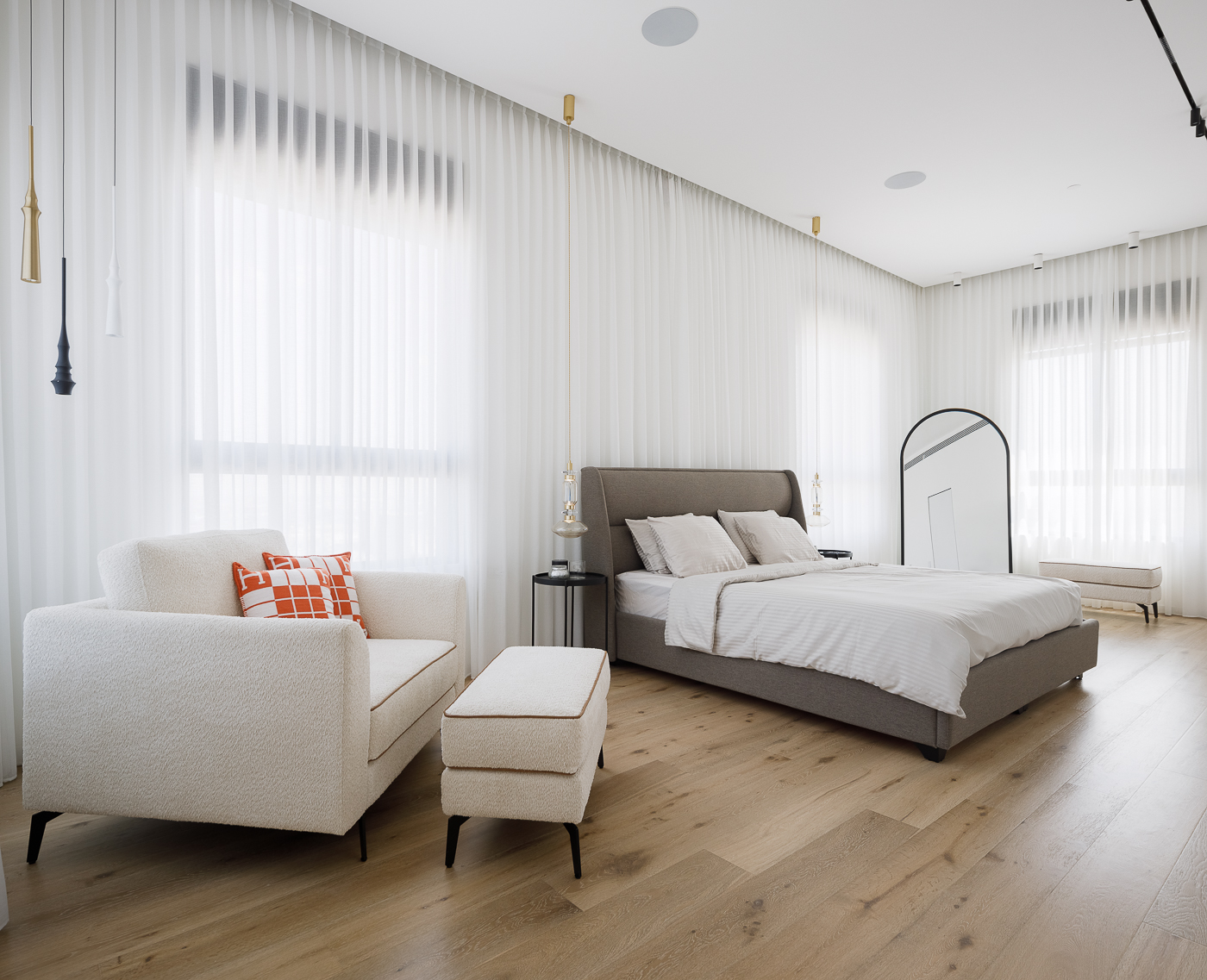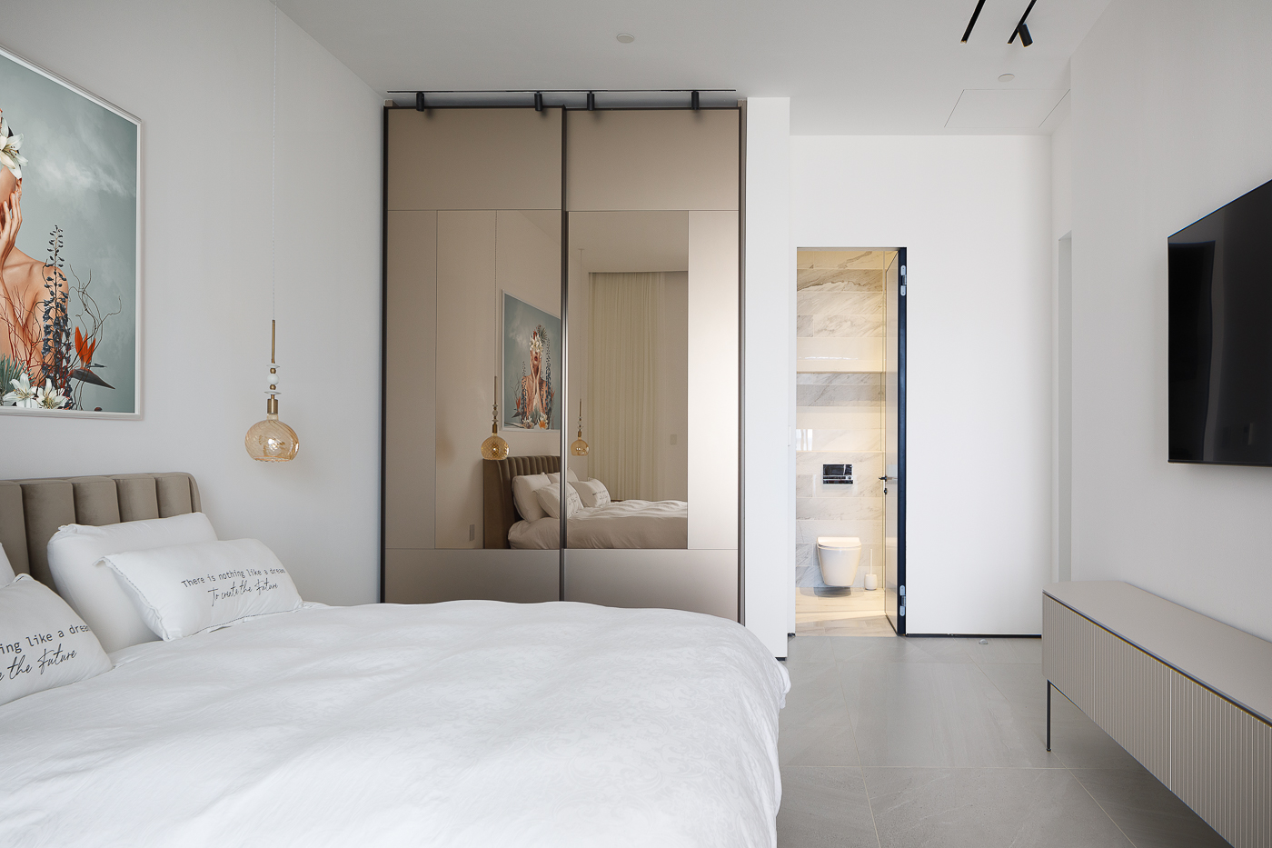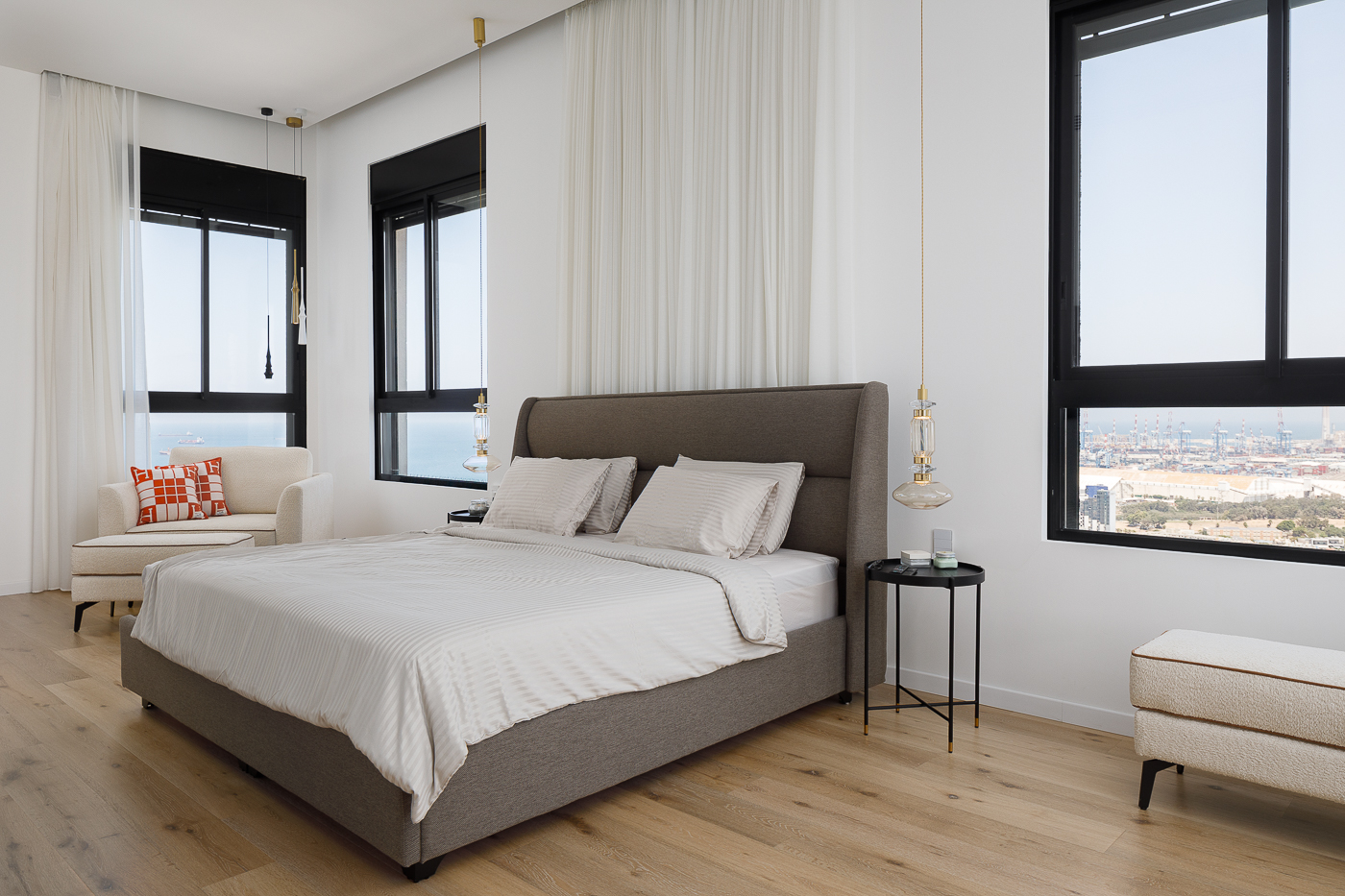 חדר השינה העיקרי ממוקם בחזית הצפונית, ומציע נוף מדהים של הים, העיר והנמל. בעיצוב הודגש הקשר עם הטבע באמצעות חומרים וגוונים הממחישים מונוכרומטיות של חול הים. האלמנטים המודרניים והנקיים מדגישים את אי המטבח המרשים ומשטח הכיור, העשויים גרניט פורצלן כהה דמוי שיש.