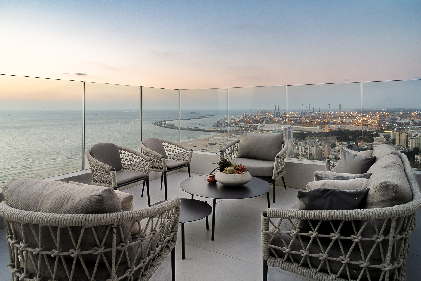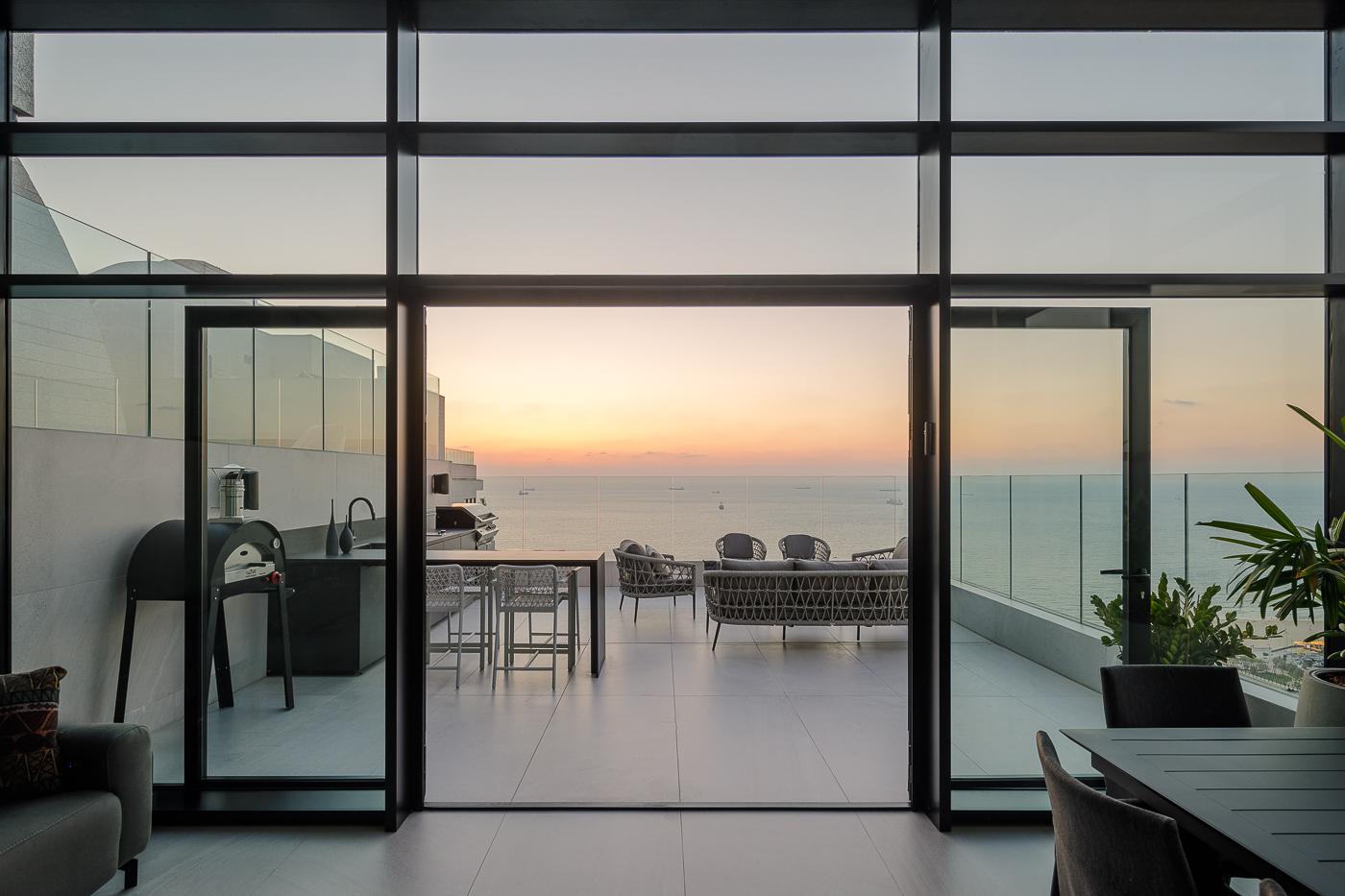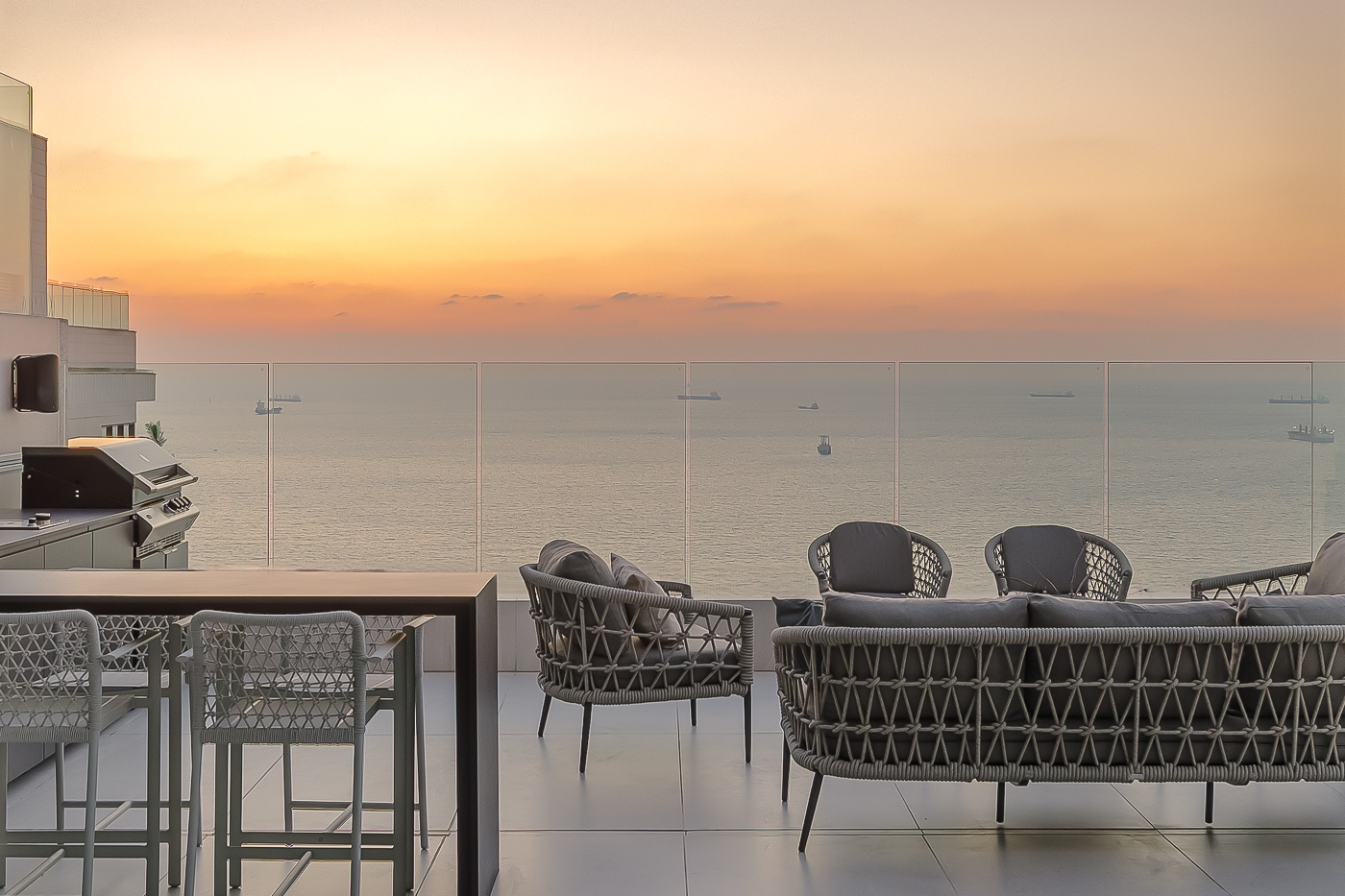 המרפסת הראשית מציעה נוף פנורמי עוצר נשימה של הים ונמל אשדוד, וכוללת אזורי ישיבה מרובים, חלקם מקורים, מטבח חוץ מאובזר ובריכה במפלס מוגבה.
