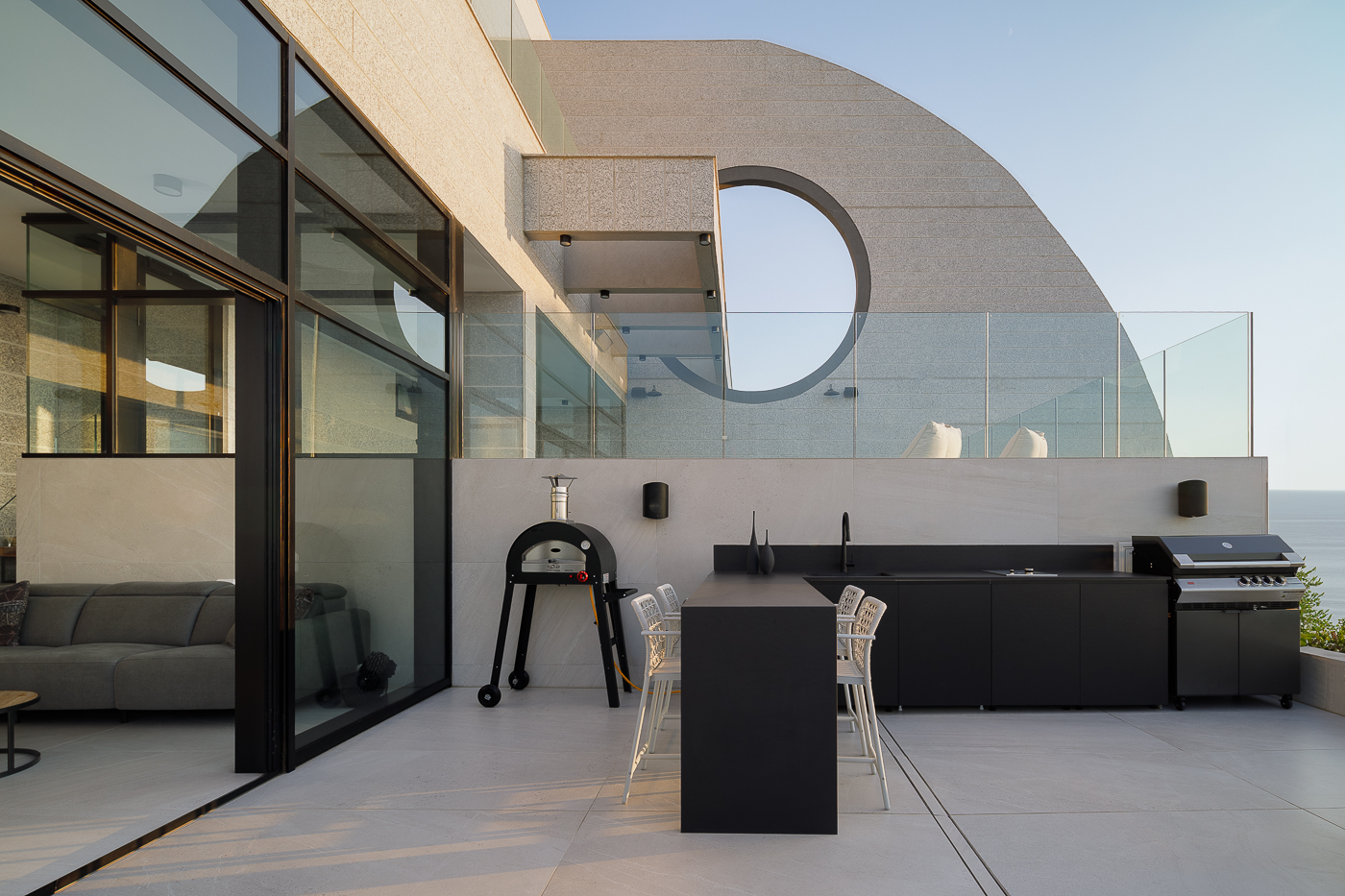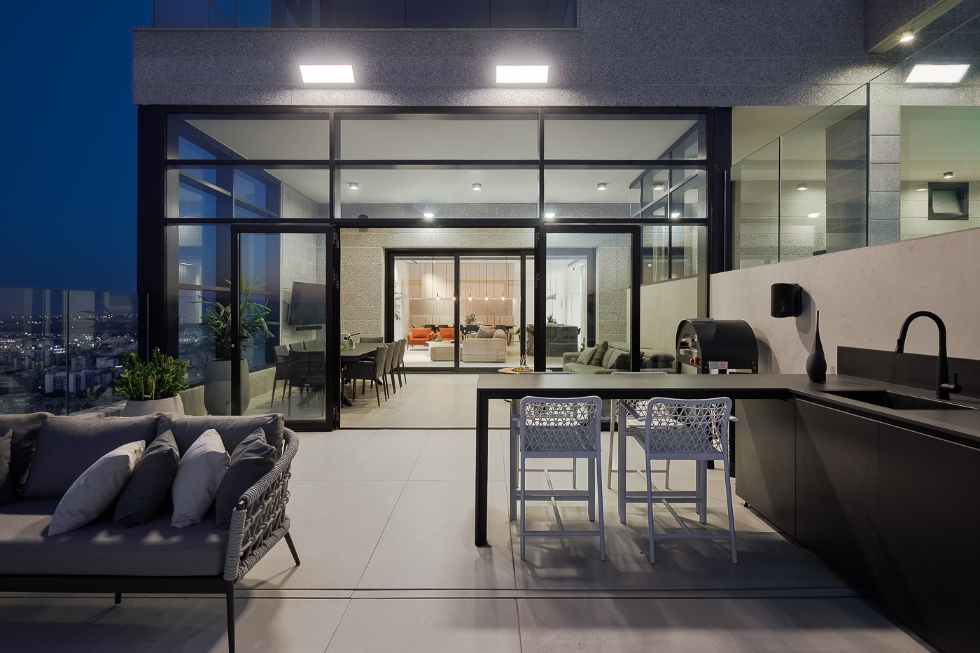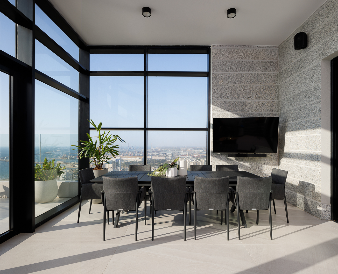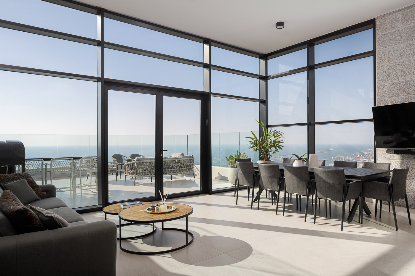 המרפסת הראשית מציעה נוף פנורמי עוצר נשימה של הים ונמל אשדוד, וכוללת אזורי ישיבה מרובים, חלקם מקורים, מטבח חוץ מאובזר ובריכה במפלס מוגבה.