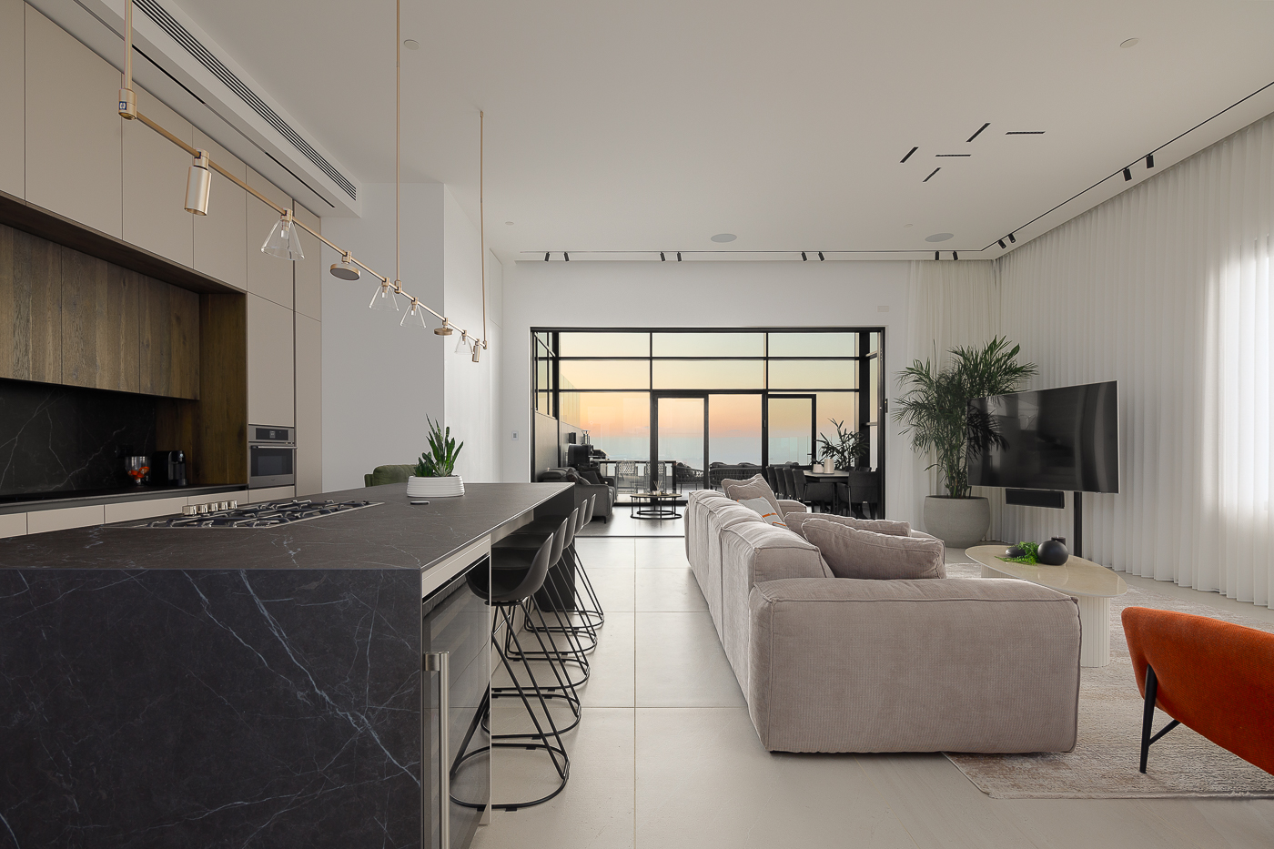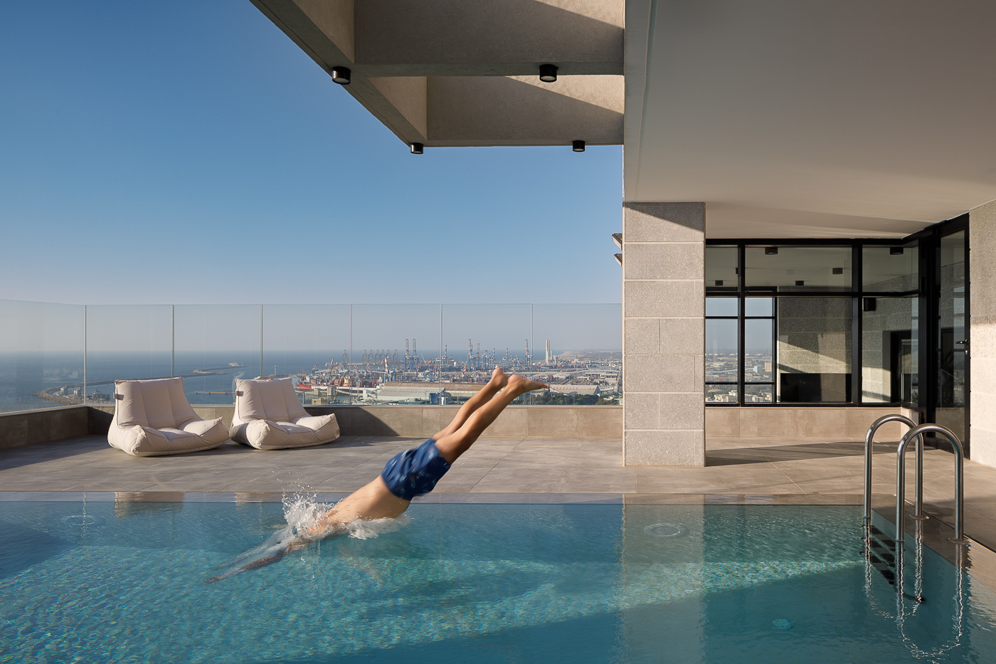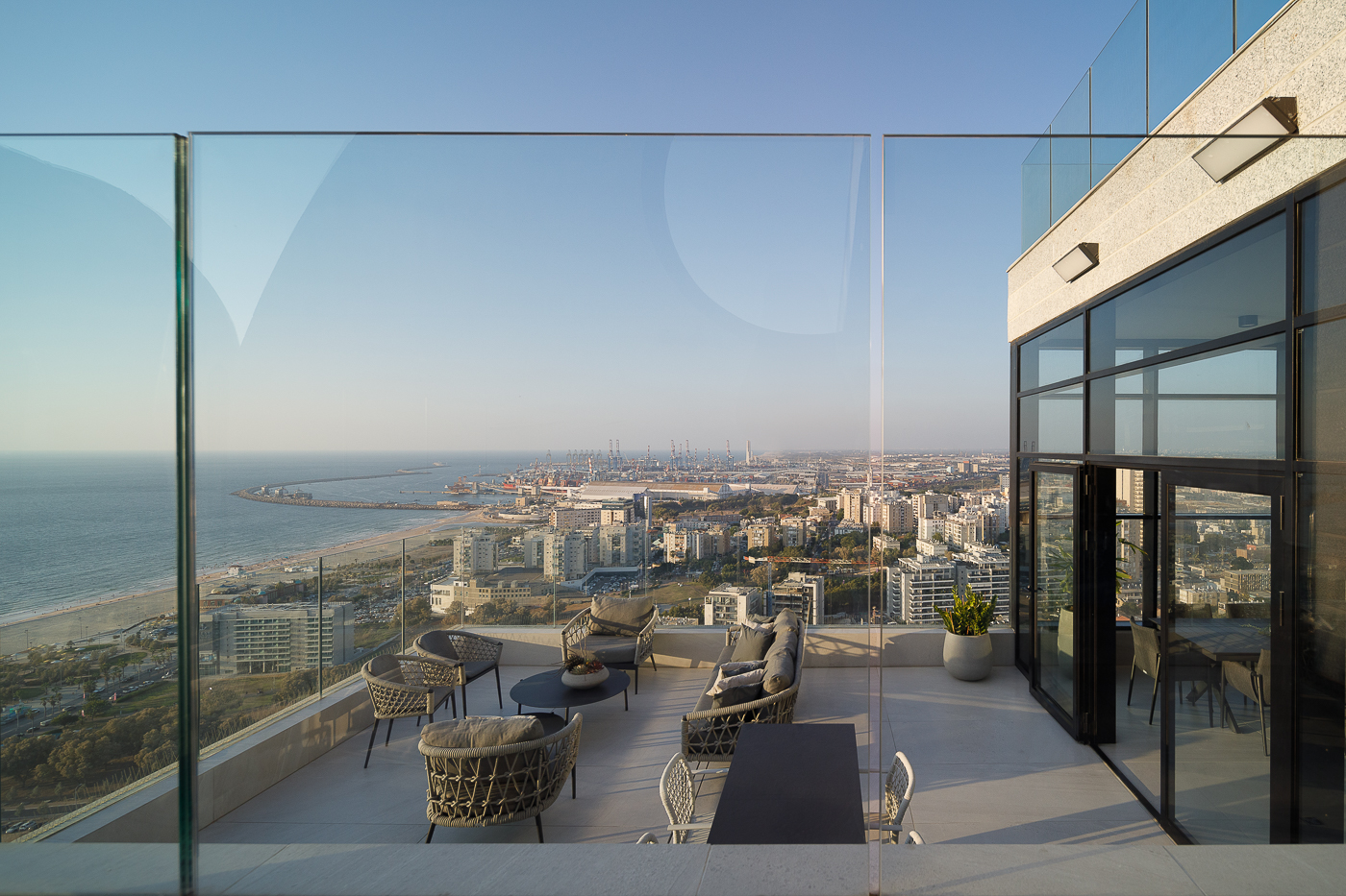 פנטהאוז הממוקם בקומה ה-28 של מגדל יוקרה באשדוד, משתרע על פני 220 מ”ר של שטח בנוי ו-110 מ”ר של מרפסות רחבות ידיים. יחד עם עצם העובדה כי הפנטהאוז נמצא בקו ראשון לים, ניתן דגש משמעותי לכך שהחיבור לנוף החובק את הדירה יקבל ביטוי מרכזי בחוויית המרחב.